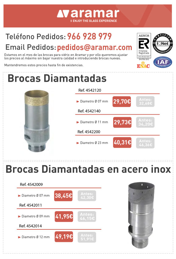 Desde Aramar nos hemos comprometido con nuestros clientes para ofrecerles una oferta en brocas para vidrio diamantadas, que les  proporcionen un máximo rendimiento, larga duración y calidad máxima en el acabado del orificio. Las brocas  están fabricadas en CARB HM dándola mayor dureza y longevidad Oferta en brocas para vidrio