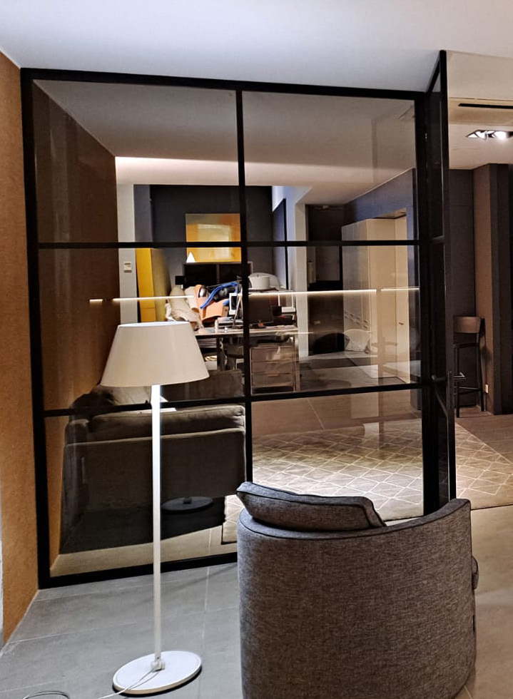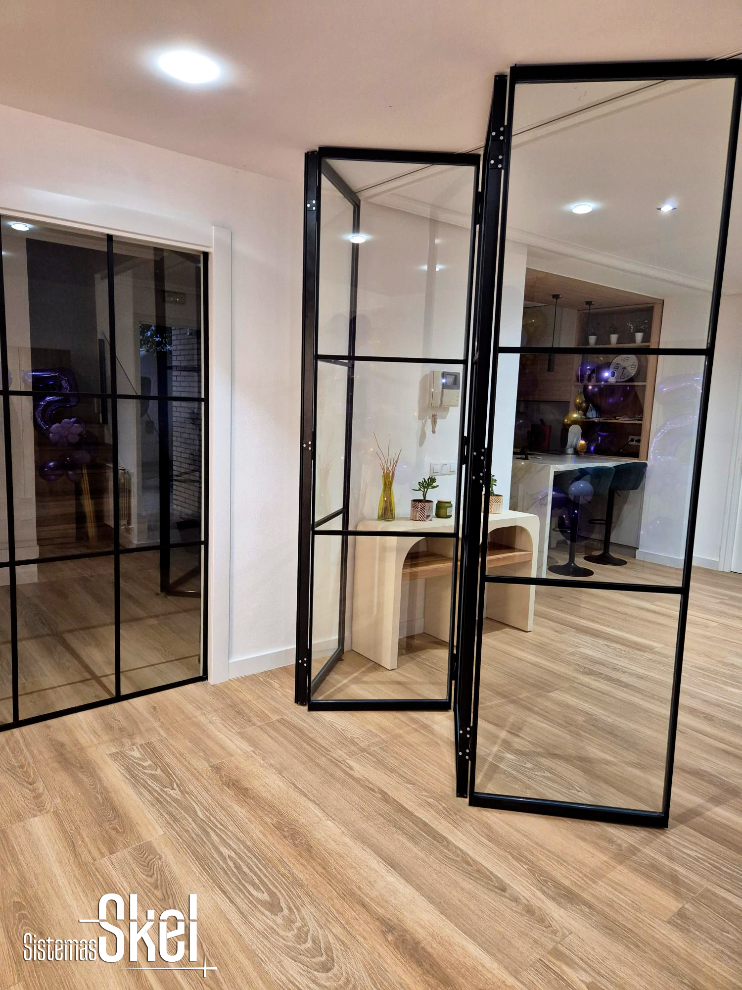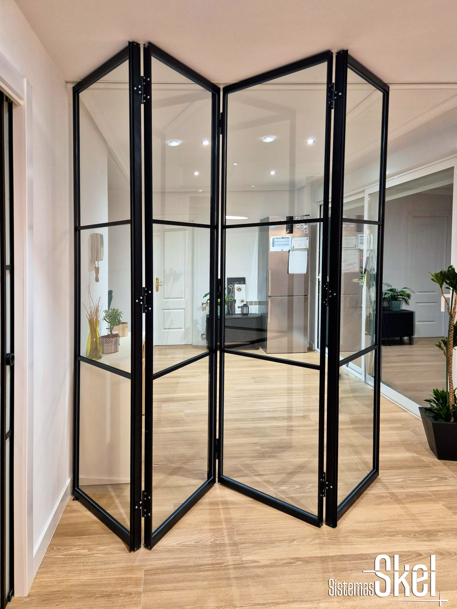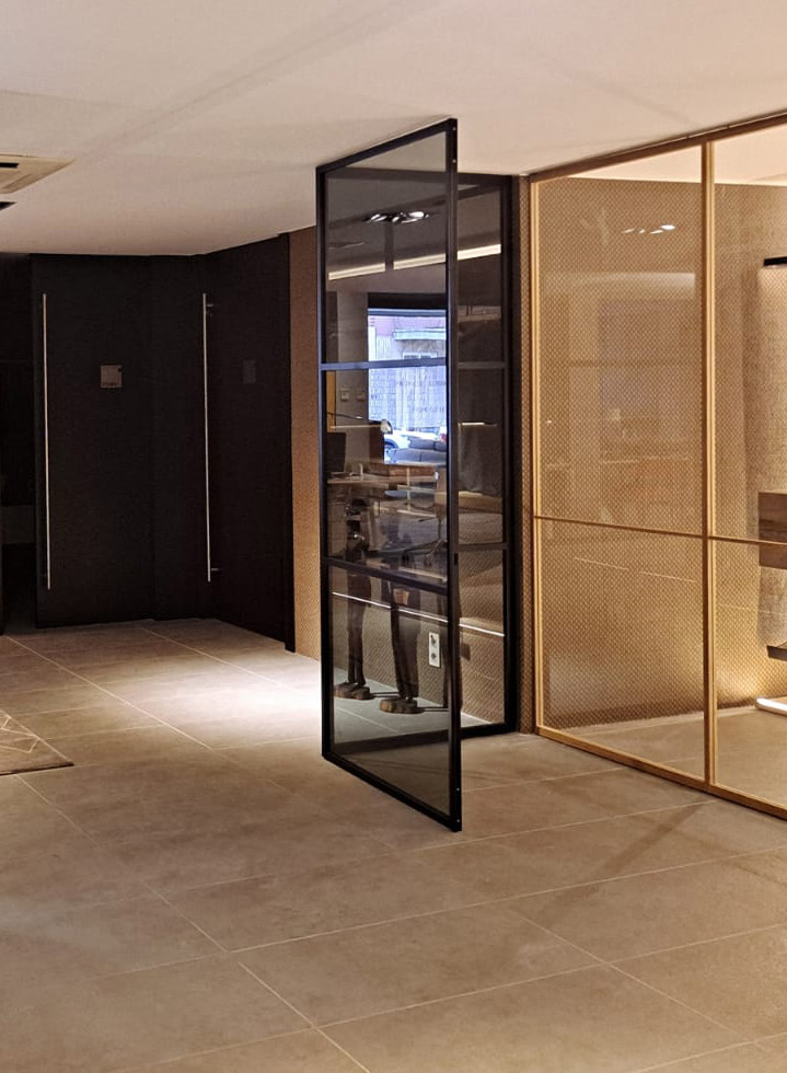 Skel es un sistema de puertas de vidrio con marco negro que redefine la manera de separar espacios. Su estética industrial, de líneas finas y precisas, aporta carácter y sofisticación sin renunciar a la ligereza visual.