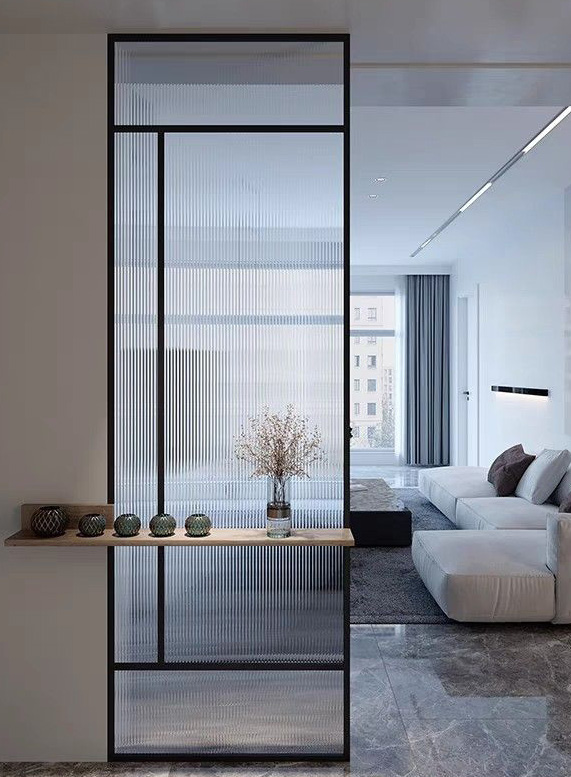 Hojas de vidrio fijo con palillería decorativa, perfectas para delimitar espacios manteniendo máxima luminosidad y coherencia estética con el resto del sistema.